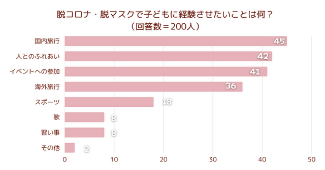 【総括】今回のアンケートで脱コロナ・脱マスクで子どもに経験させたいことは何?1位は『国内旅行』でした。