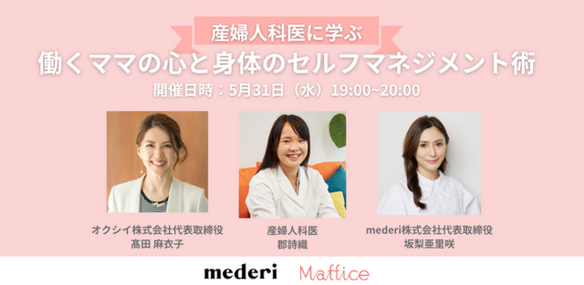 オンラインピル診療サービス「mederi Pill(メデリピル)」を展開するmederi株式会社(東京都目黒区、代表取締役:坂梨 亜里咲 以下、当社)は、2023年5月31日、ママと家族のためのシェアオフィス「Maffice」を運営するオクシイ株式会社(東京都渋谷区、代表取締役: 高田麻衣子)と共同で、育児と仕事の両立を目指す女性に向けた特別セミナーを開催いたします。