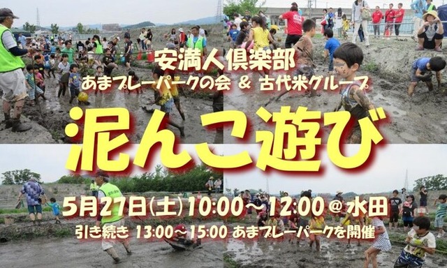 高槻市安満遺跡公園で活動する市民団体「安満人倶楽部」は、5月27日(土曜日)に、同公園にある田植え前の水田でつな引きやドッジボールなどで思い切り泥まみれになって遊ぶイベント「泥んこ遊び」と公園内でブランコなどが楽しめる恒例イベント「あまプレーパーク」を開催します。