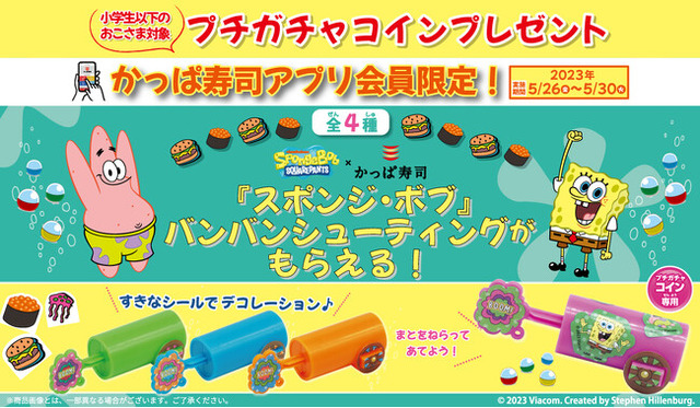 ぜひ、この機会にかっぱ寿司でご家族やご友人とのお食事をお楽しみいただき、『スポンジ・ボブ』のおもちゃ「バンバンシューティング」を手に入れてください。