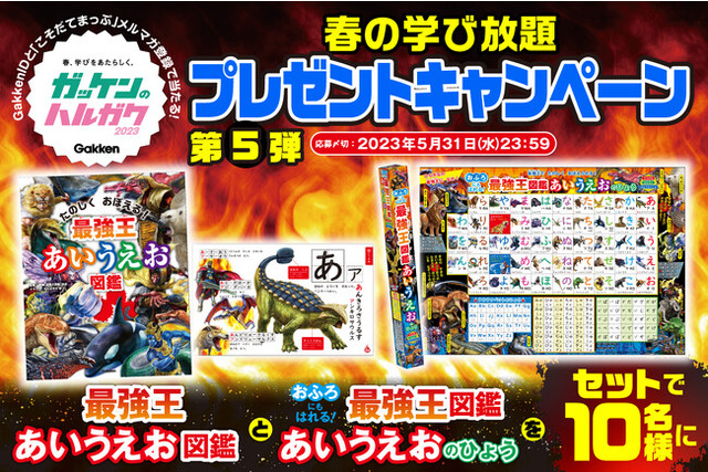 今回のプレゼントは、累計360万部のベストセラー「最強王図鑑」シリーズの新商品の『最強王あいうえお図鑑』と『おふろにもはれる! 最強王図鑑あいうえおのひょう』の2冊セット。人気の最強王たちといっしょに、楽しく「あいうえお」を学べちゃいます。