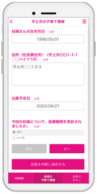 宇土市は『母子モ』の追加機能である「質問票サービス」と「オンライン予約サービス」を伴走型支援事業に活用し、妊娠届出アンケートと出生届時アンケートの提出と、妊娠届出時の来庁予約が、『母子モ』を通じて時間や場所を問わず簡単に実施できるようになります。