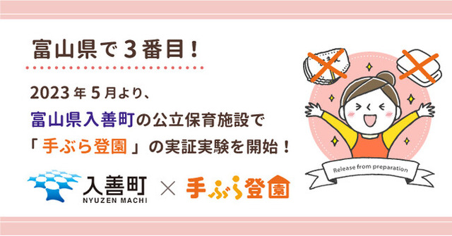 BABY JOB株式会社(本社:大阪府大阪市、代表取締役社長 上野公嗣)は、富山県入善町の公立保育施設において、BABY JOBとユニ・チャーム株式会社が提供する、保育施設向け紙おむつの定額サービス「手ぶら登園」の実証実験を、2023年5月より2か月間実施することをお知らせします。自治体が費用を一部負担するのは、富山県内では初の取り組みとなります。