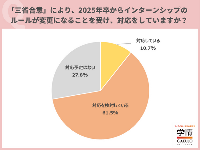 「三省合意」により、インターンシップのルールが変更になることを受け、「対応を検討している」と回答した企業が61.5%に上りました。また、10.7%の企業が「対応している」としています。「早期に学生と接点を持ちたい」「他社の動向を踏まえて対応を決めたい」「学生からも、就業体験ができるインターンシップが求められている」などの声が寄せられました。
