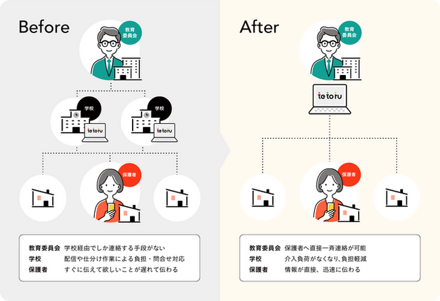 tetoruを通して、教育委員会から管轄内の公立小学校・中学校などに在籍する児童生徒の保護者に対して一斉連絡ができるようになります。