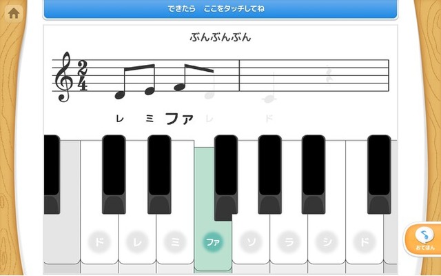 今回は画面上でピアノを弾く「ひいてみよう」シリーズで、「きらきら星」「ぶんぶんぶん」など初めてピアノを弾く子でも取り組みやすい曲を追加予定です。弾くべき鍵盤が光って誘導され、演奏に合わせてアニメーション付で楽譜とドレミなどの音名が表示されます。一般的なアプリでは、楽譜付きで表示されるものは多くありませんが、「天神」では楽譜付きで表示します。これは、小学校の音楽の学習指導要領の「楽譜を見て歌う」を意識したもので、幼児期から楽譜に慣れておくことで、小学校以降の音楽の学習に抵抗なく取り組めるようにという狙いがあります。
