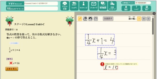 手書き入力した途中式をチェックすることにより、どこで何を間違えたのかがわかる機能です。これまで以上に児童生徒の主体的で個別最適な学習が進むことが期待されるとともに、先生の指導の充実が期待できます。