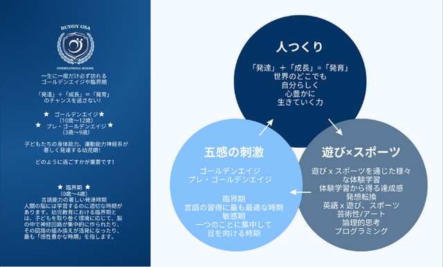 BUDDY GSA International School (BGIS) は、2歳から6歳の子どもたちを対象としたユニークな学びの場として誕生しました。知的、創造的、個人的、社会的、身体的能力向上を通して、子どもたちが多彩な個人にになることを目的に現地及び海外の生徒への教育を行っています。Global Step Academyのインターナショナル教育に、様々な体験学習の中で達成感を味わい、自分自身に感動できる「心の教育」をモットーとしたBUDDYの教育、スポーツプログラムを導入したカリキュラムと、幼児教育における経験やノウハウを活かして、質の高い「人つくり」を提供しています。