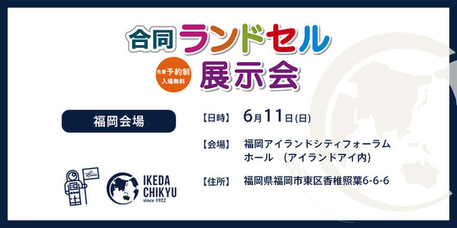 ランドセルの企画・販売を行う池田地球株式会社(本店:東京都港区:代表取締役 村尾光一)は、ランドセルの企画・販売を行う池田地球株式会社(本店:東京都港区:代表取締役 村尾光一)は、6月11日(日)に開催される「合同ランドセル展示会2023 福岡会場」 に出展いたします。