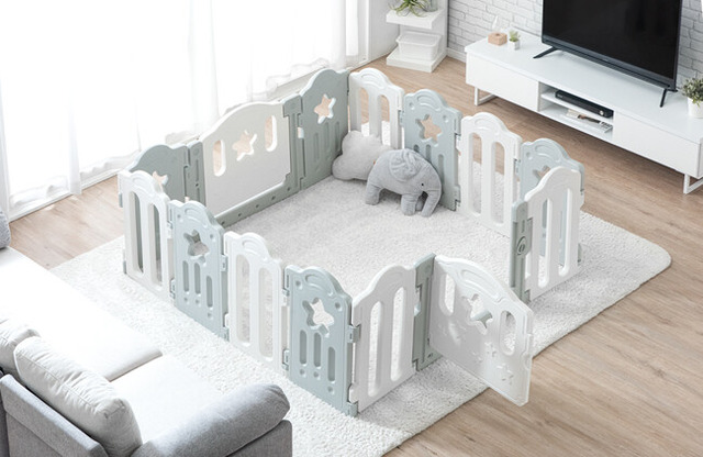 軽量素材の高密度ポリエチレンを使用しているため、ベビーサークルのパネルの解体、組み立てや移動がしやすいつくりとなっています。また、お部屋の広さや生活導線に合わせて、長方形や六角形・L字型など形やサイズを自由に組み替えられるところもポイントです。
