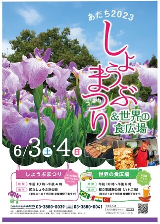 6/3、4は綾瀬・北綾瀬エリアで楽しめる、「しょうぶまつり&世界の食広場」を開催します。