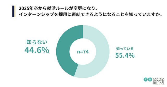 2025年卒から就活ルールが変更になり、インターンシップを採用に直結できるようになることを知っているか尋ねたところ、「知っている」が55.4%、「知らない」が44.6%という結果になりました(n=74)。