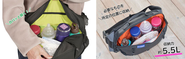 約5.5Lの収納力で、哺乳瓶や水筒などの縦型の容器を固定収納できるベルトや、おむつやお尻拭きなど、乳幼児とのお出かけの時に必要なものを重ねずに収納できます。