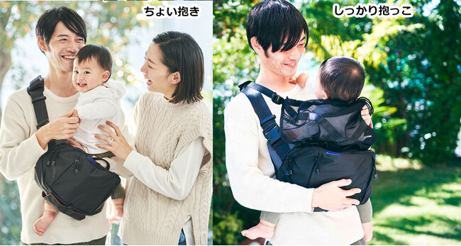 抱っこひも以外に、子育てグッズが収納できるバッグとして、抱っこ補助として使う「ちょい抱き」などシーンに合わせて使い分けができ、バッグが抱っこひもを兼ねるため、お出かけ時の荷物が少なくすみます。