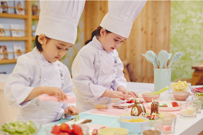 リゾナーレ八ヶ岳のキッズスタジオでは、ピクニックをコンセプトとした空間で子どもがコックコートを着て、スタッフからレクチャーを受けながらスイーツづくりを体験できます。カゴメ考案の野菜を使ったスイーツをリゾナーレ八ヶ岳が監修し、オリジナルメニュー「トマトのティラミス」に仕上げました。トマトのコンポートやトマトと苺のマリネを子どもたちが自らトッピングし完成していきます。いつもは苦手な野菜も、違った食べ方も学び、自分で作る体験を通して、食への興味や苦手克服のきっかけになります。