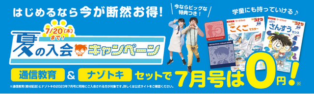 株式会社小学館集英社プロダクションが運営する『小学館の通信教育 名探偵コナンゼミ』は、通信教育とナゾトキの7月号をセットで受講すると7月号の受講料が0円となる「夏の入会キャンペーン」を2023年6月1日(木)~7月20日(木)の間で実施します。