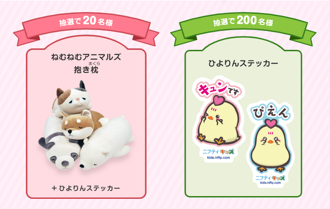 本キャンペーンは、「ニフティキッズ」のサービス開始20周年記念施策の第6弾として実施します。「ニフティキッズ」の公式SNSアカウントもしくは専用フォームにて “ニフティキッズとの想い出”を募集します。投稿いただいた方の中から抽選で220名様に、抱き枕やステッカーなどの賞品をプレゼントします。