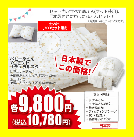 第1弾は「出産準備」、第2弾は「育児応援」、第3弾は「衣料」をテーマに、赤ちゃんとの毎日の暮らしに役立つアイテムをお得なプライスでお届けいたします。