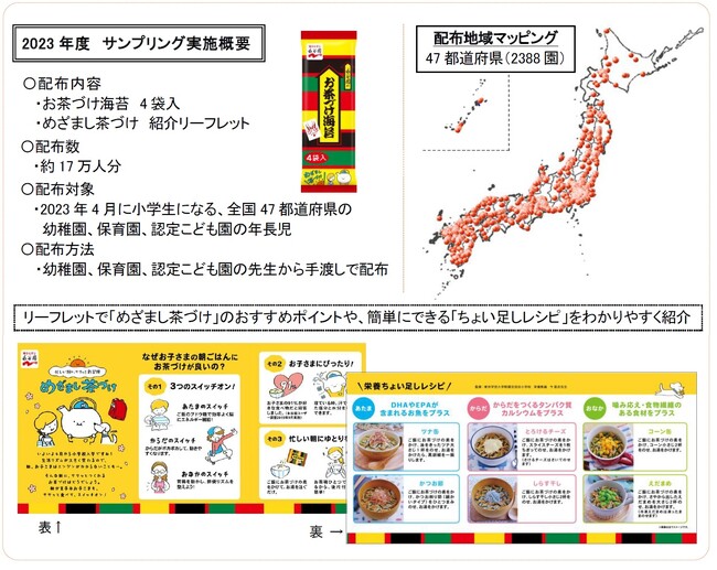 株式会社 永谷園(社長:成田 健一、東京都港区)は2023年3月上旬に、同年4月に小学校に入学する全国47都道府県の幼稚園、保育園、認定こども園に通う年長児17万人に対して、今年で2回目となる「お茶づけ海苔」のサンプリングを実施いたしました。
