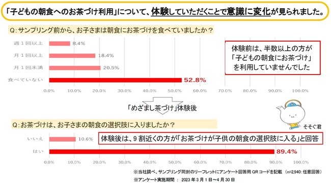 小学校入学後の新しい生活は楽しみと期待が大きい反面、生活リズムや生活環境の変化により様々な不安も生じます。特に、朝のバタバタの原因にもなる子供が「朝起きられない」「朝食をなかなか食べてくれない」ことに対する悩みや不安を持つ親御さんも多いのでは?と考えて始まったのがこのサンプリング企画です。今回も“朝が苦手なお子さまもササっと食べられるお茶づけ”を朝ごはんの新習慣としてご提案する「めざまし茶づけ」を多くの方に体験していただき、その体験結果を報告いたします。