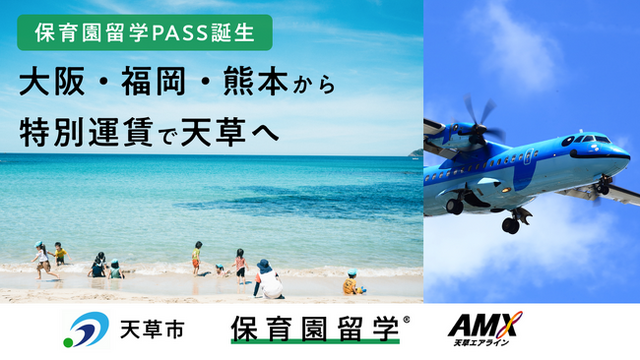 地域と子育て家族をつなぐ暮らし体験「保育園留学(R)️」を展開する株式会社キッチハイク(本社:東京都台東区、代表取締役CEO:山本雅也)は、留学先である熊本県天草市、および天草エアライン株式会社(本社:熊本県天草市、代表取締役社長:永岡真)と連携し、全国初の交通サービス連携として「保育園留学(R)️PASS」をスタートしました。天草市への保育園留学(R)️利用者は、「保育園留学(R)️PASS」で特別運賃※の適用を受けることができ、福岡=天草が4,000円、大阪=天草(熊本経由)が合計10,000円となります。天草市は現在2023年度の予約を2地域で募集中。移動手段も含めて子育て家族がより訪れやすくなる地域創生の取り組みとして、都市部からの天草市の保育園留学(R)️利用家族の受け入れを加速します。