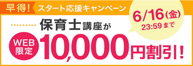 2023年6月16日(金)まで、WEBからの受講お申込み限定で保育士講座の受講料を10,000円割引いたします。