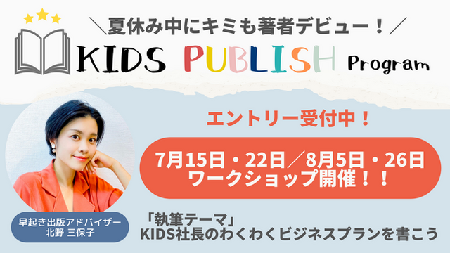 二人の子どもの子育てをしながら起業し、出版プロデューサーや朝活習慣化アドバイザーとして活躍している北野三保子が講師を務め、夏休みの期間を使ってチームで電子書籍を作り、Amazonで販売し著者デビューを果たすというプログラムです。今回は「もし私が社長だったら?」をテーマに計4回のワークショップと個別フォローを45,000円(税込)で提供致します。