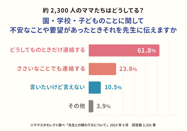 わが子の園や学校での様子がわからず不安を感じたときに、保護者は先生に連絡や相談をするもの。今回ママスタセレクトでは「子どものことで不安や要望があるとき、先生に伝えていますか?」というアンケートを実施。選択肢には「ささいなことでも連絡する」「どうしてものときだけ連絡する」「言いたいけれど言えない」「その他」を設定し、2,300人を超えるママたちから回答が寄せられました。