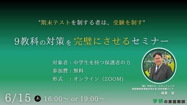 株式会社学研ホールディングス(東京・品川/代表取締役社長:宮原博昭)のグループ会社、株式会社学研エル・スタッフィング(東京・高田馬場/代表取締役社長:伊藤弘雅)は「【定期テスト対策第3弾・中学生の保護者必見!】9教科の対策を完璧にさせるセミナー」を2023年6月15日(木)に開催いたします。