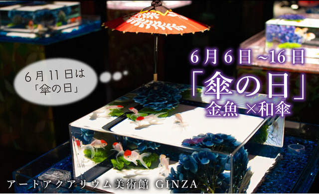 6月11日の「傘の日」に合わせ、6月6日(火)~6月16日(金)の期間限定で、「新金魚品評」の作品エリアにも和傘が飾られます。