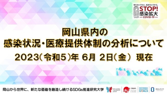 新型コロナウイルス感染症(COVID-19)のパンデミックはWHOから宣言終了が行われ、わが国でも通常の生活が戻りつつありますが、岡山県内の感染・医療体制の状況を把握する点や、みなさまの日常生活における感染予防対策のご参考になればと思い、情報提供を継続しています。よろしくお願い申し上げます。