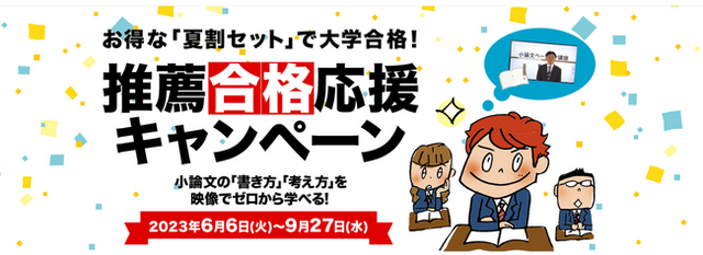 株式会社 学研ホールディングス(東京都品川区/代表取締役社長:宮原博昭)のグループ会社、株式会社Gakken(東京都品川区/代表取締役社長:五郎丸徹)は、学研のプライム講座のオンライン映像授業による推薦・総合型入試対策講座「学研推薦・総合型選抜ゼミ」において、2023年6月6日(火)より、お得な「夏割セット」を限定販売する「推薦合格応援キャンペーン」を実施します。「夏割セット」は、当ゼミで人気の高い「小論文対策講座」と「志望理由書・面接対策講座」をセットにした特別講座。独学では難しいと言われている学校推薦型や総合型選抜で合格するための書く力を映像講座でわかりやすく解説し、通信添削でしっかりと指導、ゼロから合格力を身につけることができます。キャンペーン期間は9月27日(水)まで。