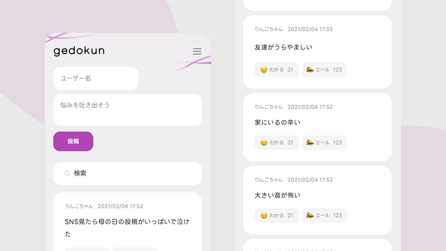 家庭環境の悩みが集まる掲示板。リプライ機能はなく、共感のボタンで励まし合います。