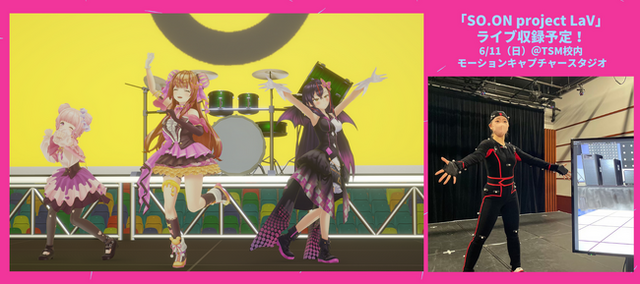 TSM校内スタジオにて、滋慶学園COMグループの全国高等課程・高等専修学校のバーチャルアイドル「SO.ON project LaV (ソーオンプロジェクトラブイ) 」のライブを株式会社クレッセント(東京都江東区)のサポートの下、学生が自ら出演・撮影をおこない収録します。本収録を通じて、学生は最新技術をプロ直伝で学ぶことができます。