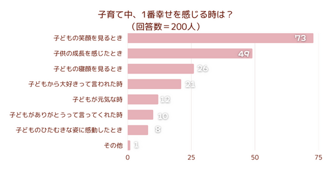 「子育て中、1番幸せを感じる時は?」とアンケート調査した結果、1位は『子どもの笑顔を見るとき』でした。