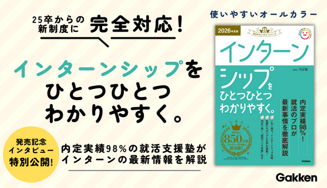 株式会社 学研ホールディングス(東京・品川/代表取締役社長:宮原博昭)のグループ会社、株式会社 Gakken(東京・品川/代表取締役社長:五郎丸 徹)は、「就活をひとつひとつ」シリーズより『インターンシップをひとつひとつわかりやすく。』を2023年6月8日(木)に発売しました。あわせて、就職活動支援塾・内定塾講師へのインタビューを公開しました。
