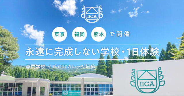 学校法人イデア熊本アジア学園 イデアITカレッジ阿蘇(熊本県南阿蘇村、校長 井手修身、以下IICA)は、「永遠に完成しない学校・1日体験」と題して高校3年生およびその保護者、社会人を対象とした1日体験イベントを東京・福岡・熊本の3都市で開催することをお知らせいたします。