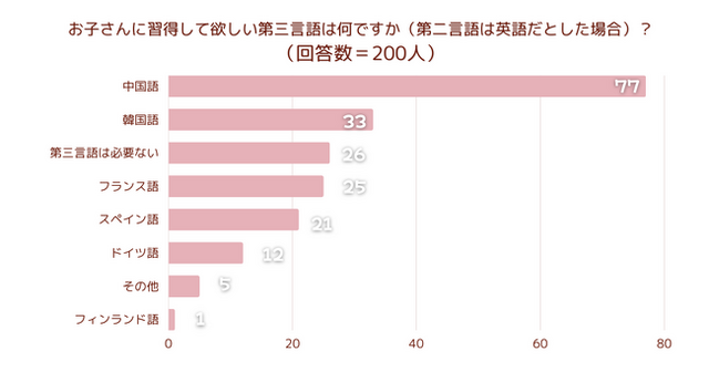 「お子さんに習得して欲しい第三言語はありますか?(第二言語は英語だとした場合)」とアンケート調査した結果、1位は『中国語』でした。