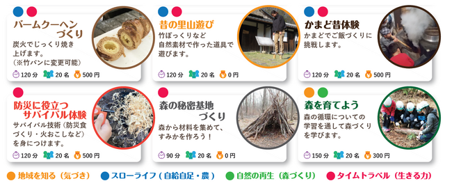 「自然を愛する力」「五感を使う力」「生きる力」を培うための4つの体験テーマに沿った様々なメニューをご用意しています。