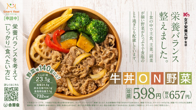 栄養バランスを考えてしっかり食べたい方向けの美味しさと健康を兼ね備えた商品です。吉野家の「牛丼」は並盛でタンパク質量が20gです。このタンパク質量は一度に摂る量として多すぎず少なすぎず、筋合成に理想的なタンパク質を摂取できます。牛肉は体内で合成できない9つのアミノ酸を十分に含む質の良いタンパク質と、さらに鉄や亜鉛といった新陳代謝には重要ですが欠乏しやすいミネラルを豊富に含んでいるからです。このため、「牛丼ON野菜」は一食で理想のタンパク質量が摂れる「牛丼」と1日に必要な野菜の約半分を摂れる温野菜の両方を味わえます。牛丼は吉野家ならではの牛丼のうまさを、温野菜はガーリックを利かせた胡麻油が野菜本来の味わいを引き立てています。一食における温野菜の量は145gで、緑黄色野菜とブロッコリー、かぼちゃ、赤ピーマンと食物繊維の摂れるれんこん、ヤングコーンと様々な食材の栄養と歯触りも楽しめる商品設計となっています。スマートミールの「しっかり」の基準に申請中のサイズは並盛で、「牛丼ON野菜」並盛の価格は本体価格598円(税込657円)となります。