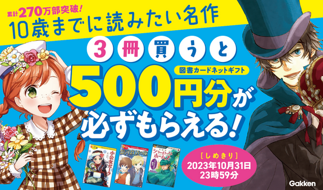 株式会社 学研ホールディングス(東京・品川/代表取締役社長:宮原博昭)のグループ会社、株式会社 Gakken(東京・品川/代表取締役社長:五郎丸徹)は、2023年6月1日(木)より『10歳までに読みたい名作シリーズを3冊買うと500円分の図書カードネットギフトが必ずもらえる』キャンペーンを開催しています。
