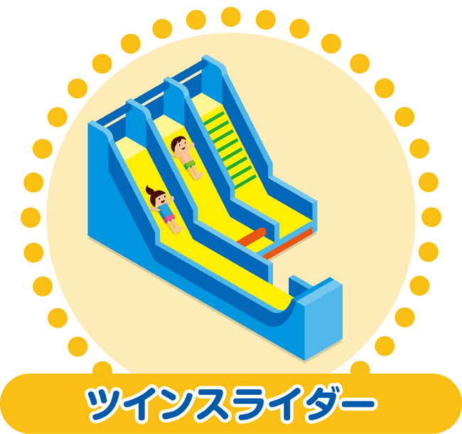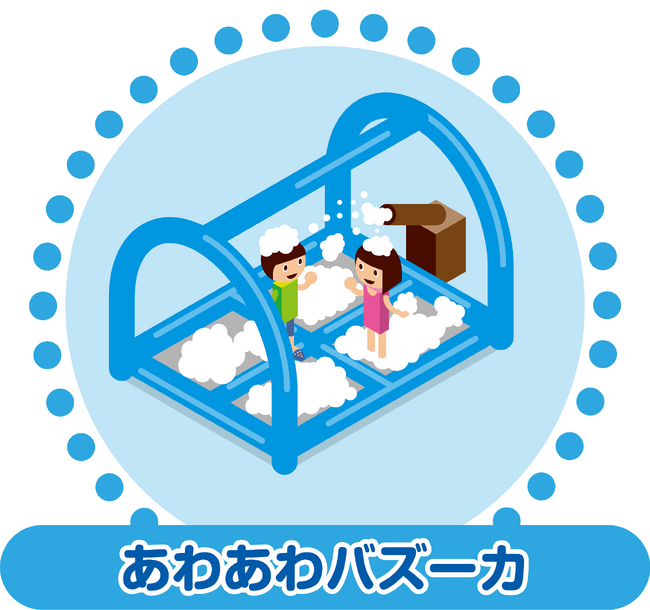 今年は、【ざぶ~んダブルスライダー】に替わり、ロングとショートのストレートスライダー【ツインスライダー】と【あわあわホイップ】に替わり、バズーカからふわふわの泡が飛び出す【あわあわバズーカ】が新たにアトラクションに加わるほか、初登場以来大人気の【ホエールアドベンチャー】、【マジカルミスト】、2歳までのお子様限定の【よちよちエリア】も展開します。