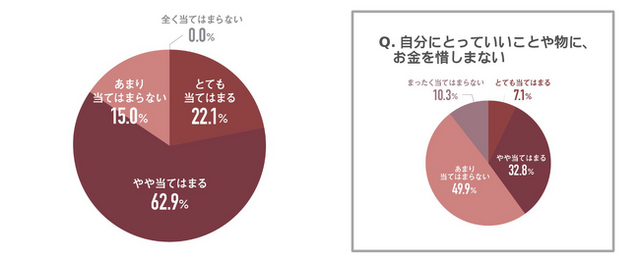 22.1%が「とても当てはまる」、62.9%が「やや当てはまる」と回答、「とても当てはまる」「やや当てはまる」の合計が8割超となりました。いいことや物にはお金を惜しまない 、ということは、子どもに対して付加価値のある物やサービスが選択されると考えられます。 反対に、「自分にとっていい ことや物にお金を惜しまない」割合は4割ほどで半分以下の結果となりました。