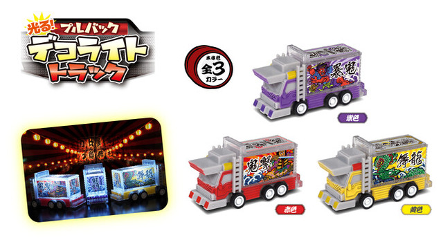 特徴:プルバック仕様のデコライトトラックがお家を駆け巡る!集めたくなる絵柄違いの3種類がラインナップ。荷台の点灯機能を使用すれば、闇夜に輝く姿は、まさに「輝く漢の魂」。