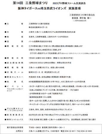 このプロ野球ファーム戦は、三条市内の企業や野球関係者でつくる実行委員会が、野球を通じて地域の賑わいをつくることを目的に三条野球まつりと銘打ち、2009年阪神ソフトバンク戦を実現して以来コロナ禍で中止になった2020年、2021年を除く毎年継続開催し(2021年はイースタン、ウエスタンの2回開催)、本年で14回目となります。