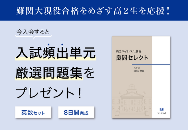 英語・数学の入試頻出分野から高2の夏時点で取り組める良問をセレクトした限定問題集を、Z会の通信教育をお申し込みいただいた高2生の方にプレゼントします。
