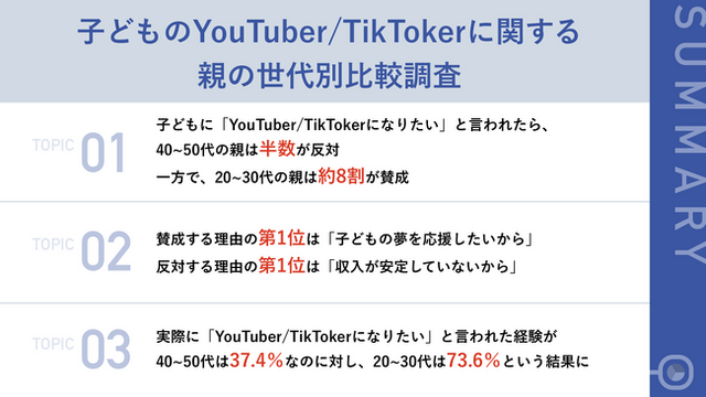 我が子が「YouTuber/TikTokerになりたい」と言った場合、40~50代の親の約半数が「反対」、一方で20~30代の親の約8割が「賛成」と回答