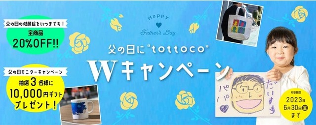 株式会社スコープ(本社:東京都千代田区、代表取締役社長:横山 繁)は、お子さまが描いた絵をクリエイターがアートに仕上げて、グッズにプリントする新サービス『tottoco』を提供しています。この度、父の日を記念して、2023年6月19日から30日まで、モニター募集と全品20%オフのWキャンペーンを実施します。