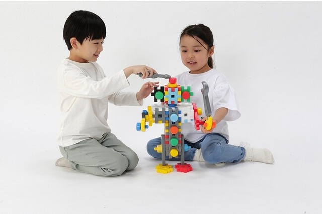 また、パーツが大きいため、1.5歳からお使いいただいても誤飲の心配がなく、お子さまのファーストブロックにぴったりです。最初は積む&こわす遊びからスタートし、食べ物や線路などに見立てる遊び、パーツを自由に組む遊び、そして頭の中で考えたものを作品にする遊びへと発展し、小学生になるまで長く遊んでいただけます。