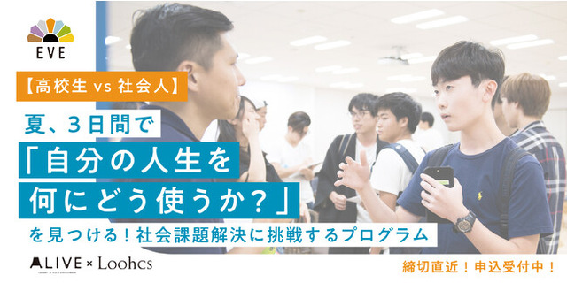 総合型選抜・AO推薦入試専門塾のルークス志塾を運営するLoohcs株式会社(代表取締役 :嶺井 祐輝 以下「ルークス」)と、日本最大級の異業種混合型リーダーシップ開発プロジェクトを提供する一般社団法人ALIVE(代表理事:庄司 弥寿彦、以下「ALIVE」)は、社会課題をテーマに、高校生・大学生・社会人が協働して、課題解決を通じて学び、その後の人生に火をつけるプロジェクト「EVE(イブ)」の募集を開始します。